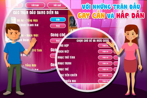 Đến với đấu trường âm nhạc bạn sẽ có cơ hội so tài âm nhạc cùng bạn bè trên chính chiếc điện thoai của bạn. Nghe và trả lời câu hỏi liên quan tới 10.000 bài hát Việt Nam và Quốc tế. Đây là game âm nhạc hấp dẫn nhất trên trên di động.