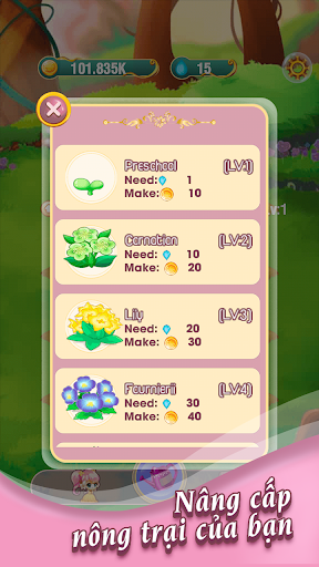 Jkgroup xin trân trọng giới thiệu một tựa game hợp nhất và xây dựng xứ sở công chúa - nông trại của bạn. Trò chơi công chúa - nông trại của chúng tôi có cốt truyện bắt nguồn từ một xứ sở mang tên nữ nhi quốc bao gồm 20 cô công chúa xinh đẹp, họ đều là những tiểu thư đài cát có tiếng, mỗi công chúa đều có một sở thích và tính cách khác nhau. Bạn có thể kết hợp các công chúa giống nhau để tạo ra những công chúa có cấp bậc cao hơn. Mỗi lần kết hợp các công chúa sẽ tạo ra được một giọt nước, sau đó bạn có thể dùng nước để tưới cho cây. Tưới nước cho các mầm hoa để nâng cấp chúng đến một cấp độ mới! Mỗi cấp độ cao hơn sẽ tăng số xu mà bạn có thể kiếm được. Trong quá trình cây tăng trưởng, bạn có thể thu hoạch xu bất cứ lúc nào, số xu sẽ tương ứng với thời gian trồng cây và cấp độ của cây. Các tính năng hợp nhất Công chúa: • Khám phá 20 đối tượng tuyệt vời để kết nối, hợp nhất. • Thu thập các cô công chúa xinh đẹp cho bộ sưu tập của bạn. • Thực hiện các nhiệm vụ và nhận phần thưởng. • Kết hợp hai loại trò chơi: ghép đôi và nông trại.